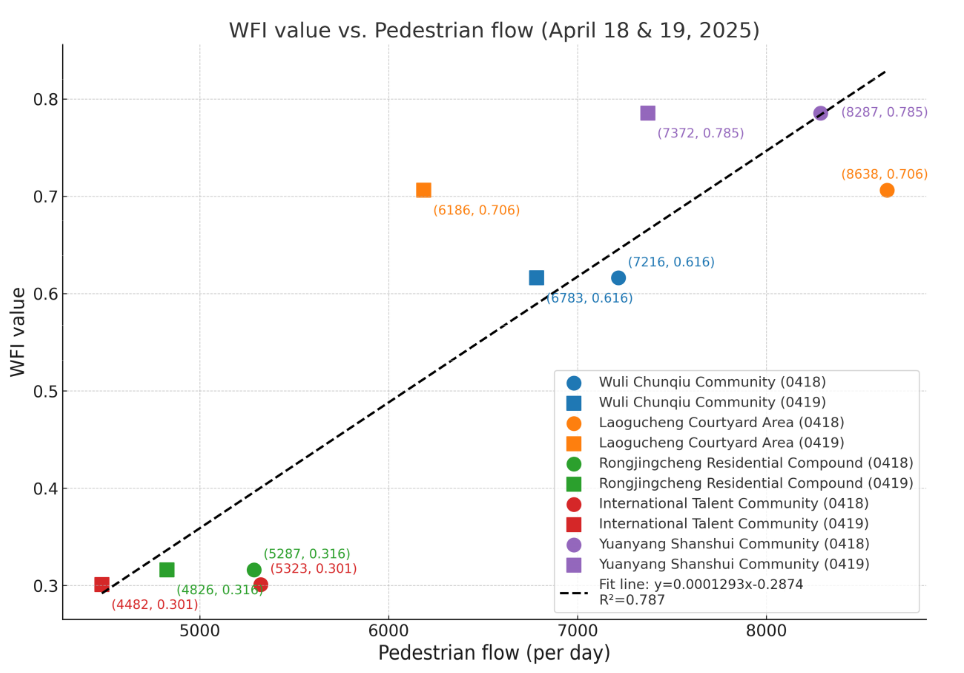 模型验证:WFI 与行人流量强正相关(r=0.887),模型可靠。