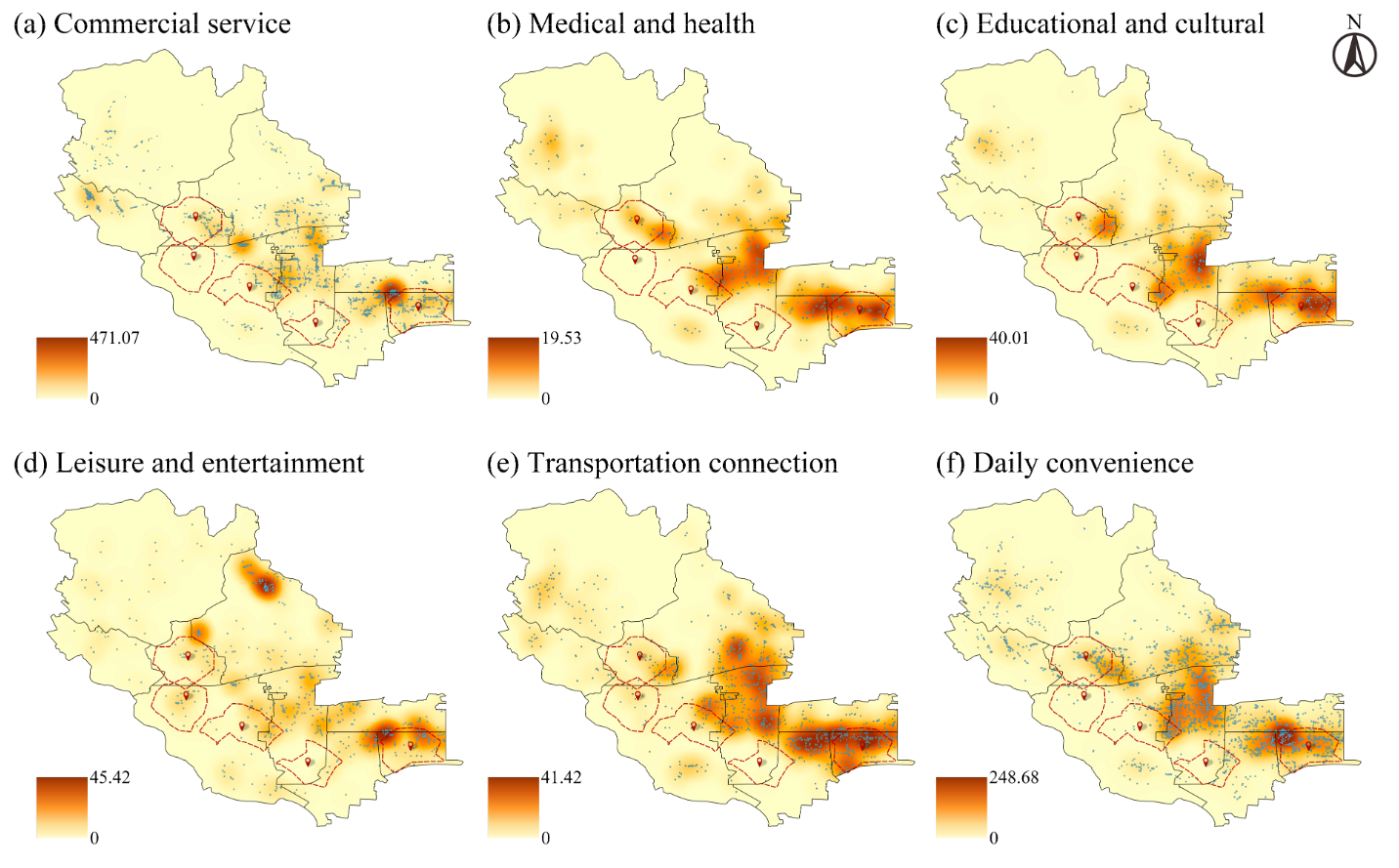 POI 数据:来自高德地图,经清洗、去重后按功能分为商业服务、医疗健康、教育文化等 6 大类,结合政府统计年鉴与实地调研验证,用于反映服务设施空间分布。