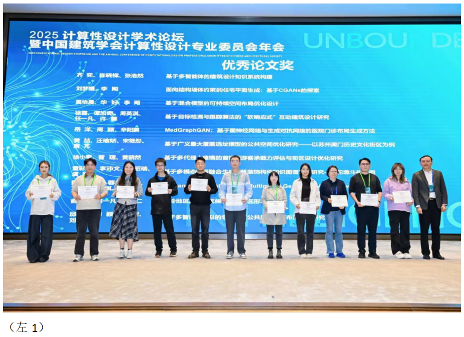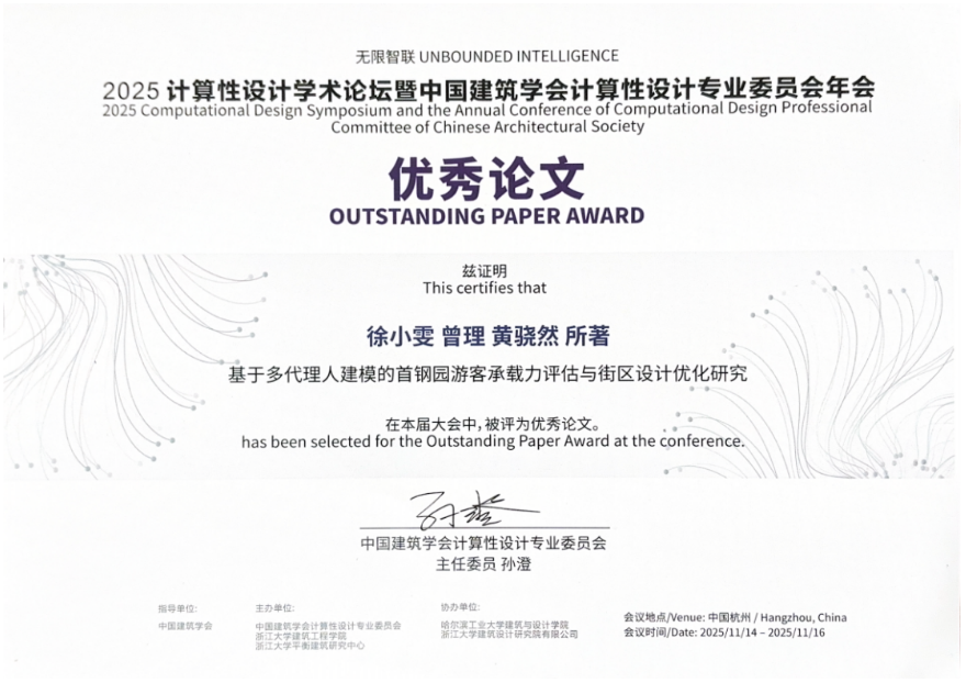 From November 14th to 16th, 2025, the 2025 Computational Design Academic Forum and the Annual Conference of Computational Design Professional Committee of Chinese Architectural Society (CDAC) were held at Zhejiang University. The paper "Research on Visitor Carrying Capacity Assessment and Block Design Optimization of Shougang Park Based on Multi-Agent Modeling" directed by Professor Huang Xiaoran and written by Xu Xiaowen and Zeng Li was successfully selected into the proceedings of the conference and won the "Outstanding Paper Award".