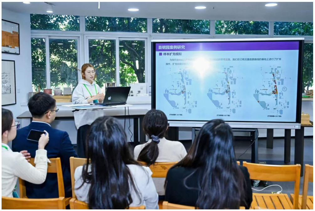 In the report session of the meeting, classmate Xu Xiaowen took Beijing Shougang Park North District as the research object and conducted in-depth discussions on a series of problems caused by the surge in the number of tourists in the current historical districts, such as traffic congestion and uneven space utilization. By combining multi-source data and multi-agent modeling techniques, she constructed a neighborhood tourist carrying capacity assessment model under the influence of interrelated factors at multiple levels.